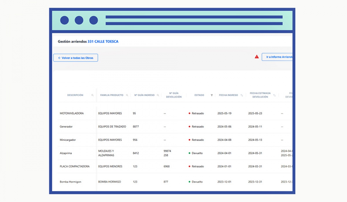 Control de Arriendos Conoce de nuestro completo módulo que te permitirá llevar acabo una correcta gestión y control sobre tus arriendos. Perfecto para administrar maquinarias, moldajes, áridos, entre otras prestaciones de arriendo. Te invitamos a conocer mas detalles a continuación.